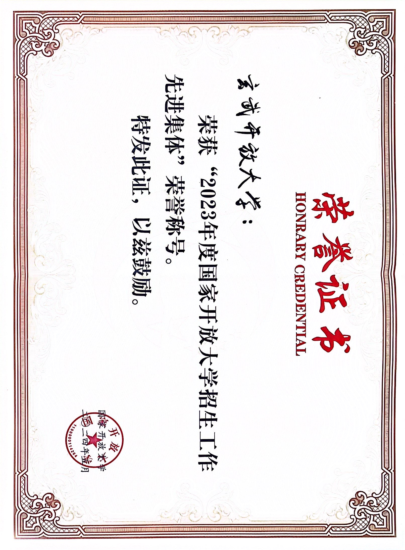 国家开放大学招生工作先进集体荣誉证书