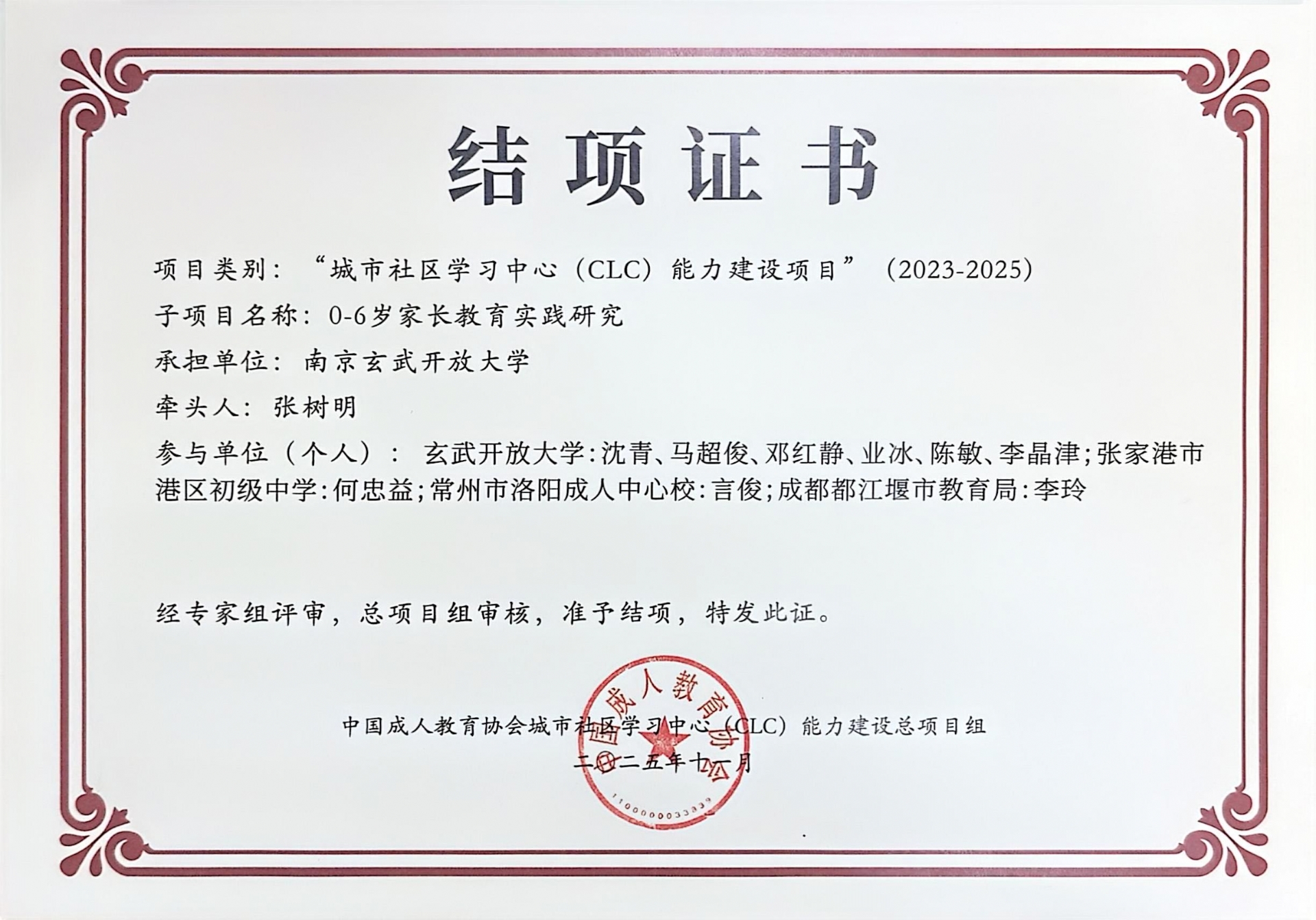 城市社区学习中心(CLC)能力建设项目(2023-2025)子项目“0-6岁家长教育实践研究”结项证书