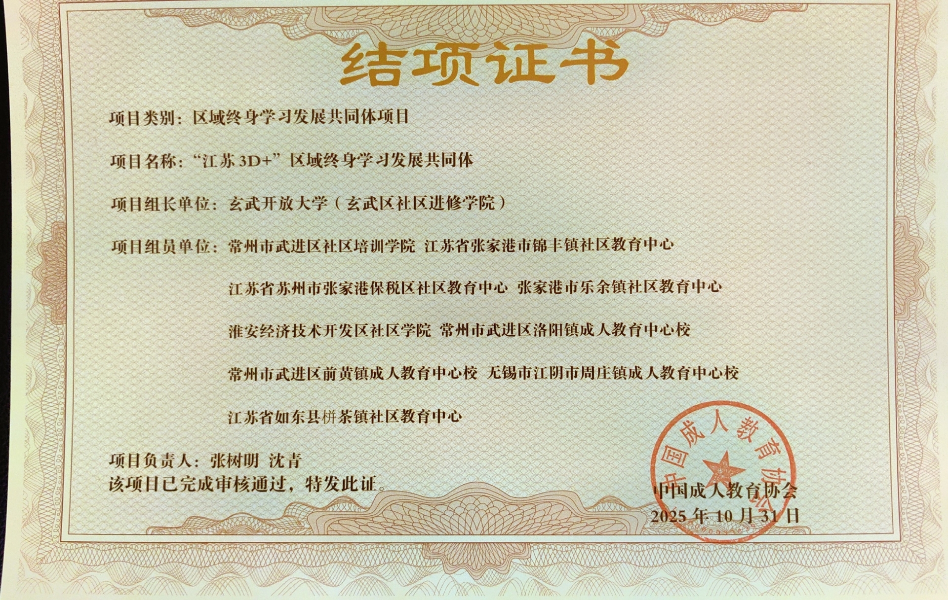 “江苏3D+”区域终身学习发展共同体结项证书