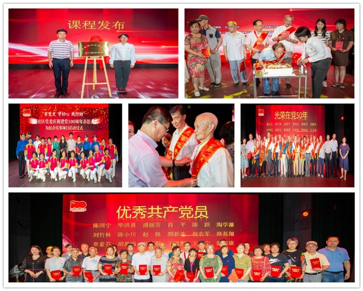 6月29日下午,玄武开放大学联合新街口街道北门桥社区的百余名党员们在1913“国民小剧场”欢聚一堂,共同参加庆祝建党100周年“学党史 守初心 践行动”表彰大会暨为民办实事项目启动仪式。本次活动由玄武开放大学、新街口街道北门桥社区党委主办,南京中山大厦有限公司党委、南京国民小剧场、大发房地产集团协办。参加活动的领导有南京市教育局职社处处长黄子亮、玄武开放大学校长业冰、区妇联副主席周艳红、区关工委主任李红、玄武区社区进修学院办公室主任沈青、玄武医院党委副院长林艳冰、新街口街道工委委员、城建城管中心主任陈伏海,新街口街道副主任徐军、关工委主任叶海阳以及北门桥社区党建联盟单位主要负责人约150人出席活动。本次活动分为“礼赞篇”、“ 征程篇”、“庆贺篇”三个部分。