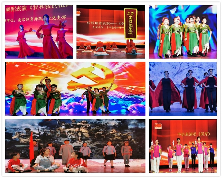 现场活动中,玄武老年开放大学北门桥办学点——山水情艺术团为大家带来的音诗舞蹈表演《唱支山歌给党听》、朗诵班师生的诗歌朗诵《光的赞歌》,情景剧《永不褪色的红》、体育舞蹈《我和我的祖国》、老年模特队带来的服装秀《我爱你,中国》,通过一首首赞歌“礼赞篇”,歌颂了中国共产党勇于革命、敢于胜利的宝贵精神,饱含对祖国无限忠诚的爱,表达对党一百年来筚路蓝缕奠基立业的崇高礼赞。在“庆贺篇”中,为14位整十年政治生日党员,党龄最小已有10年,党龄最大60年。政治生日的“寿星”们受邀上台,集体过党员生日,全体党员起立,重温入党誓词,对党忠诚的誓言,句句铿锵有力、饱满热忱。整场活动高潮迭起,也获得场下党员观众们的热烈掌声。