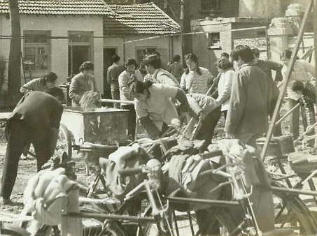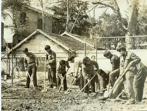 这张照片摄于1983年,当时学校刚刚搬迁,张校长带领教师为学生器械区挖坑填土做沙坑,保证学生能有安全的场所。