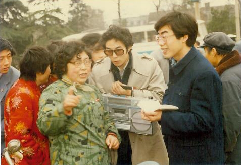 87年3月29日玄武开放大学大学生为民服务日,张笑梅校长接受采访。