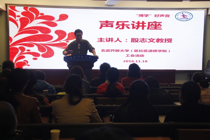 为丰富广大教职工的业余文化生活,缓解教师的工作压力,促进教职工身心健康发展,营造积极健康向上的校园文化氛围,玄武开放大学在11月18日下午2:00在207多功能教室举办了“博学”好声音教职工声乐讲座,本次讲座邀请南京艺术学院殷志文教授为老师们主讲。