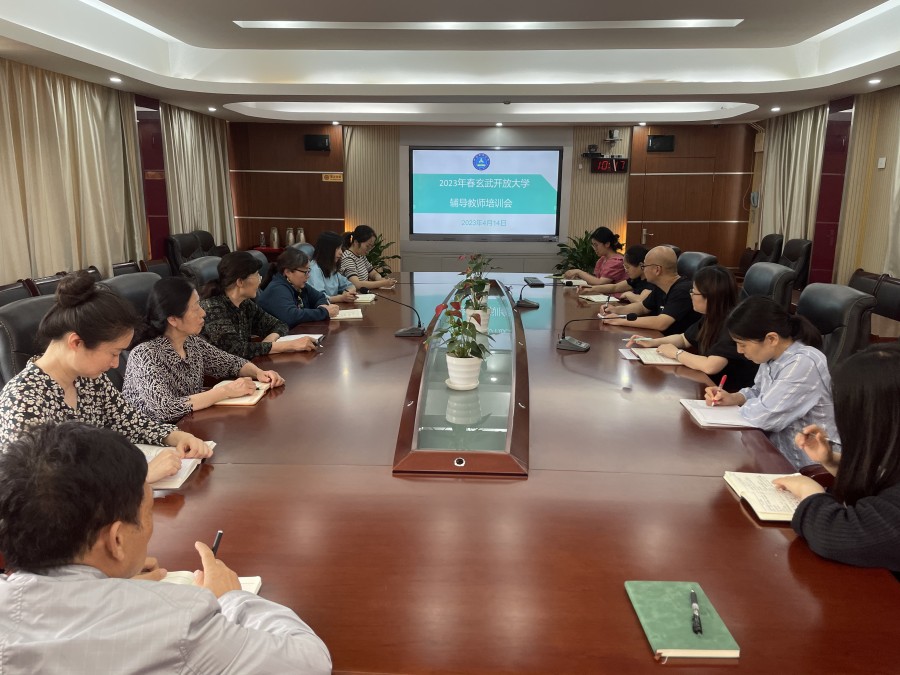 玄武开放大学于4月14日10:10组织召开了辅导老师培训会。成人教育教学部主任杨丽霞、副主任王文婷,以及相关辅导教师参加了本次培训会议。