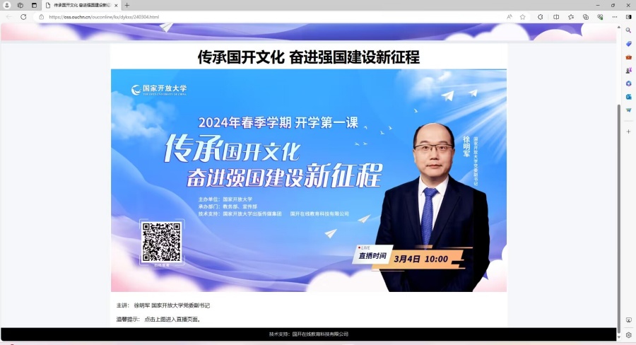 2024年3月4日10:00,2024 年春季学期开学初,国家开放大学党委副书记徐明军将以视频直播方式主讲“传承国开文化 奋进强国建设新征程”的“开学第一课”,玄武开放大学将“开学第一课”作为入学教育的重要内容之一,及时通知并组织师生收看。