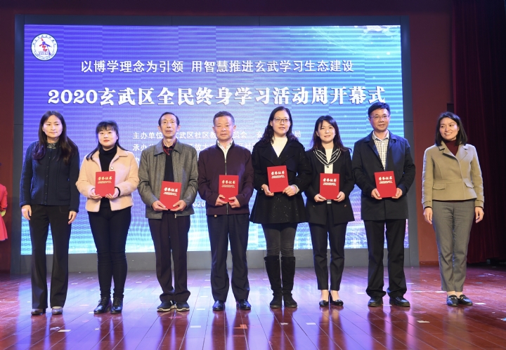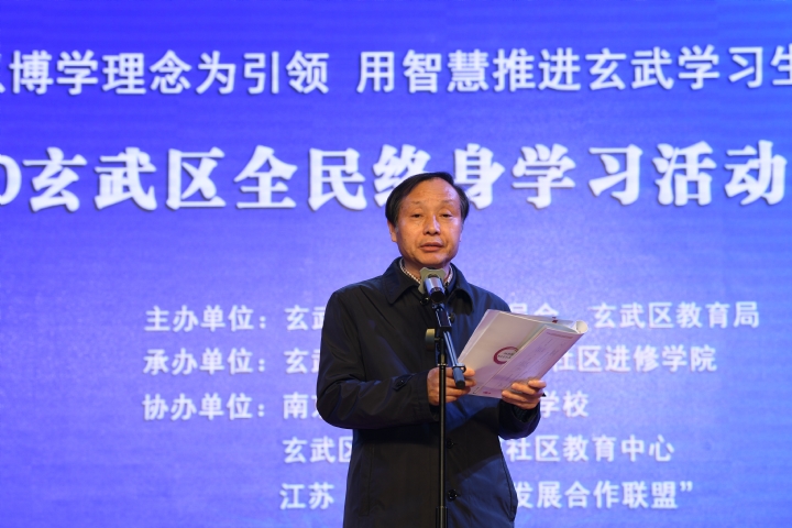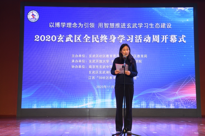 全民学习,终身学习是民族复兴赋予我们的历史使命,是追求民生优质发展的时代呼唤。2020年是一个特殊的年份,新冠病毒席卷而来,在区委、区政府的领导下,在省、市教育主管部门的工作指导下,玄武社区教育按照疫情防控工作常态化的要求,坚持以博学理念为引领,把快乐学习作为快乐生活的一部分,开展了丰富多彩的全民终身学习活动。11月20日下午,玄武区以“以博学理念为引领 用智慧推进玄武学习生态建设”为活动主题,由玄武区社区教育委员会、玄武区教育局主办,玄武开放大学、玄武区社区进修学院承办;南京市玄武中等专业学校、玄武湖街道社区教育中心、江苏“3D社区教育发展合作联盟”协办的玄武区“2020年全民终身学习活动周开幕式”在南京市玄武中等专业学校隆重举行。参加活动的领导和来宾有江苏省成人教育协会会长孙曙平,玄武区委常委、宣传部部长施扬,南京开放大学副校长张煌,玄武区委宣传部副部长韩春云、玄武区教育局二级调研员戴继根、中山陵园管理局宣教处处长杨斌,南京市教育局职社处宋冬梅科长以及玄武区各街道党工委副书记、社区教育中心主任及受表彰的居民代表、玄武开放大学、玄武中等专业学校、南京市逸仙小学师生代表约200余人参加了该活动。
