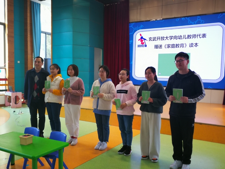 讲座前,玄武开放大学的马超俊老师代表学院向银幼的全体教师介绍了“85后父母学堂”开设的目的与意义,并向幼儿园教师代表赠送了由玄武开放大学、玄武区社区进修学院牵头主编的《家庭教育》读本。