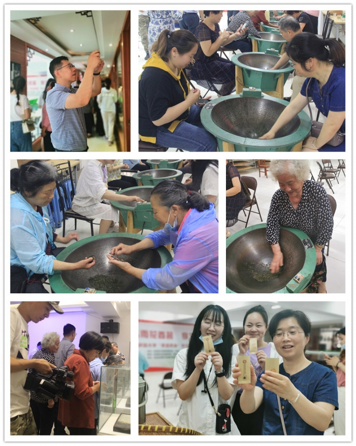 本次启用仪式重要环节,也是社区居民和与会来宾期待已久的手工炒茶环节在陈盛峰茶艺师的示范、讲解、指导下体验学习了手工炒茶过程。十几口炒锅同时开启,新鲜的茶叶在锅中翻炒。随着手掌反复运动,掌心和锅底之间的那团小绿叶,叶片渐细,颜色渐深,从翠绿转向碧绿,继而转为墨绿,最后变成一捧泛着光泽的“细针”,散发出淡淡的清香。经过一个多小时的体验学习,由自己亲手炒制的“紧、细、圆、直”的雨花茶就这么诞生了。当居民们看到自己亲手炒制的学习作品“雨花茶”,个个收获满满。