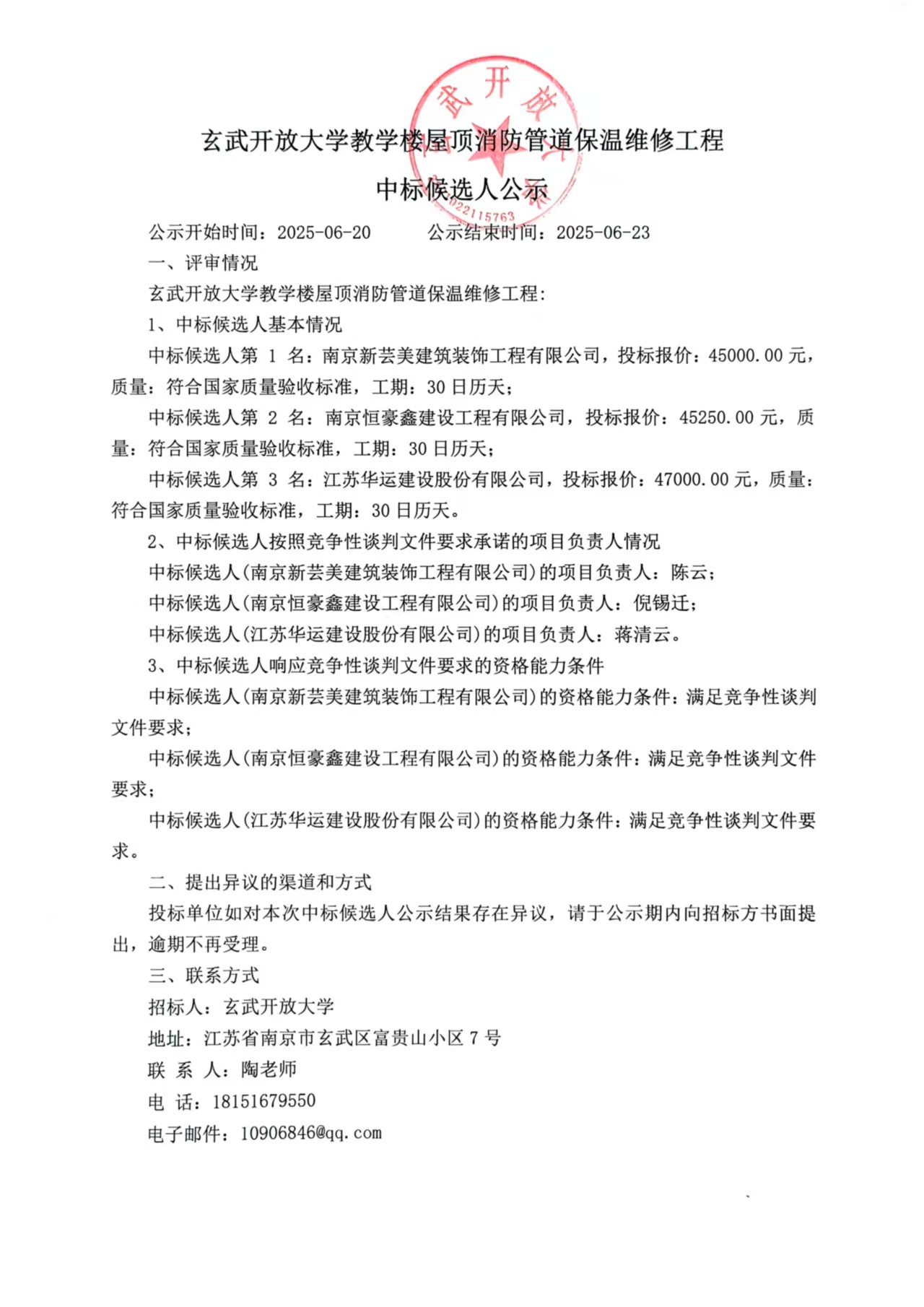 玄武开放大学教学楼屋顶消防管道保温维修工程中标候选人公示