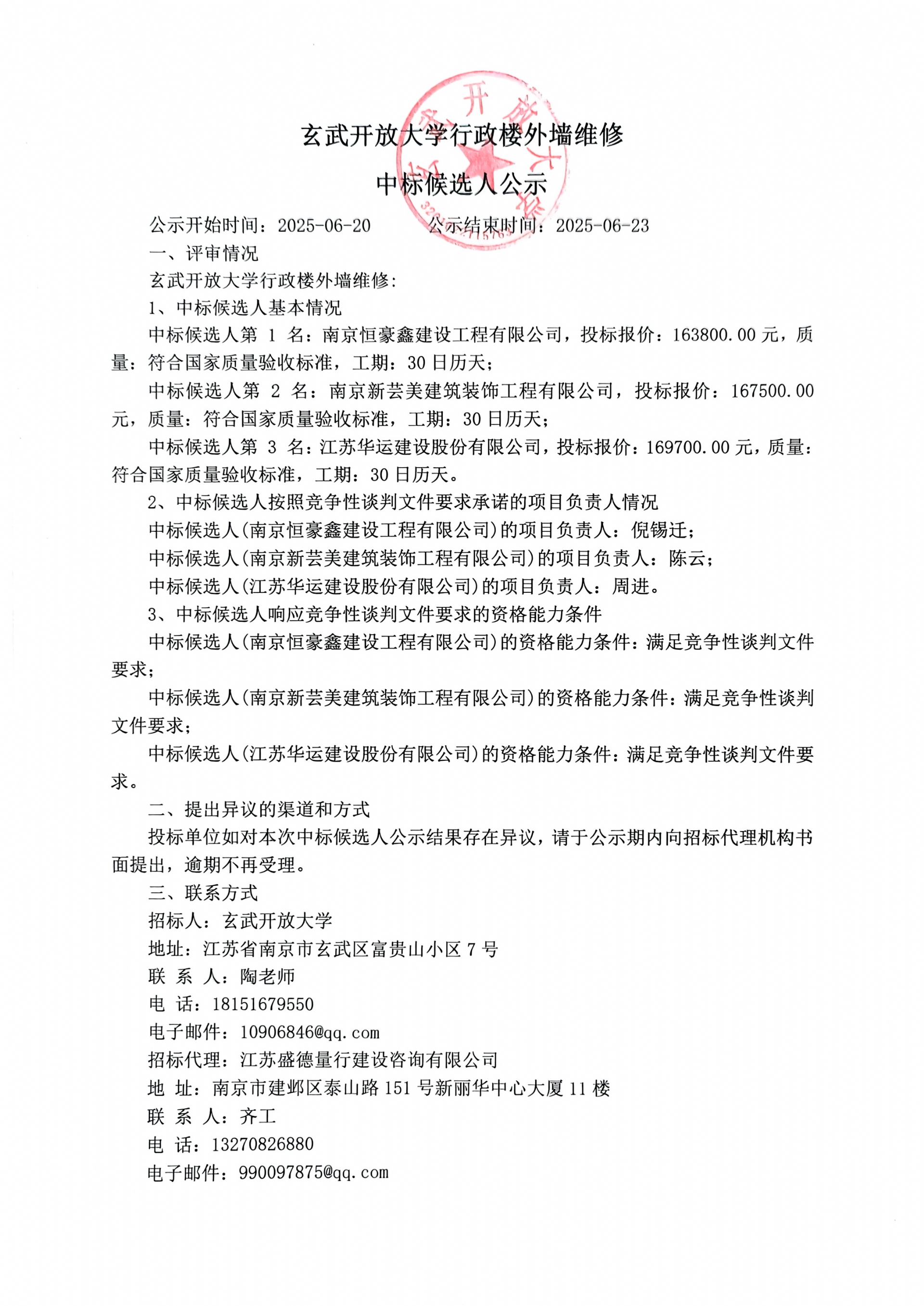 玄武开放大学行政楼外墙维修中标候选人公示