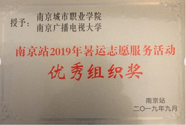 南京城市职业学院玄武分校喜获 南京站“2019年暑期志愿服务活动优秀组织奖”