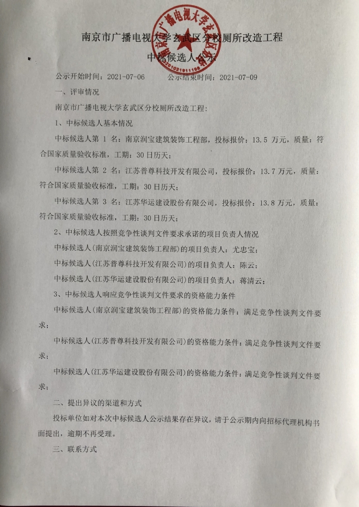 南京市广播电视大学玄武区分校厕所改造工程 中标候选人公示
