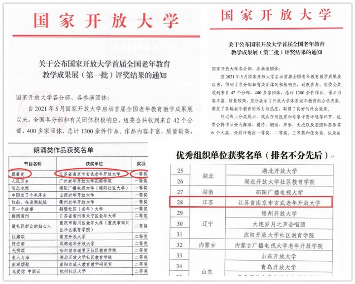 2021年是中国共产党成立100周年,玄武老年开放大学以习近平新时代中国特色社会主义思想为指导,贯彻落实党的十九届五中、六中全会精神,贯彻落实省、市教育主管部门的要求,以“博学玄武”智慧助老,推进老年教育品质发展。参加了国家开放大学2021年首届全国老年教育教学成果展评喜获优秀组织奖,也是江苏省唯一一家获得此项殊荣。我们报送的五个作品中《跟着走》荣获全国老年开放大学“朗诵类”一等奖,其他4个作品获优秀奖。