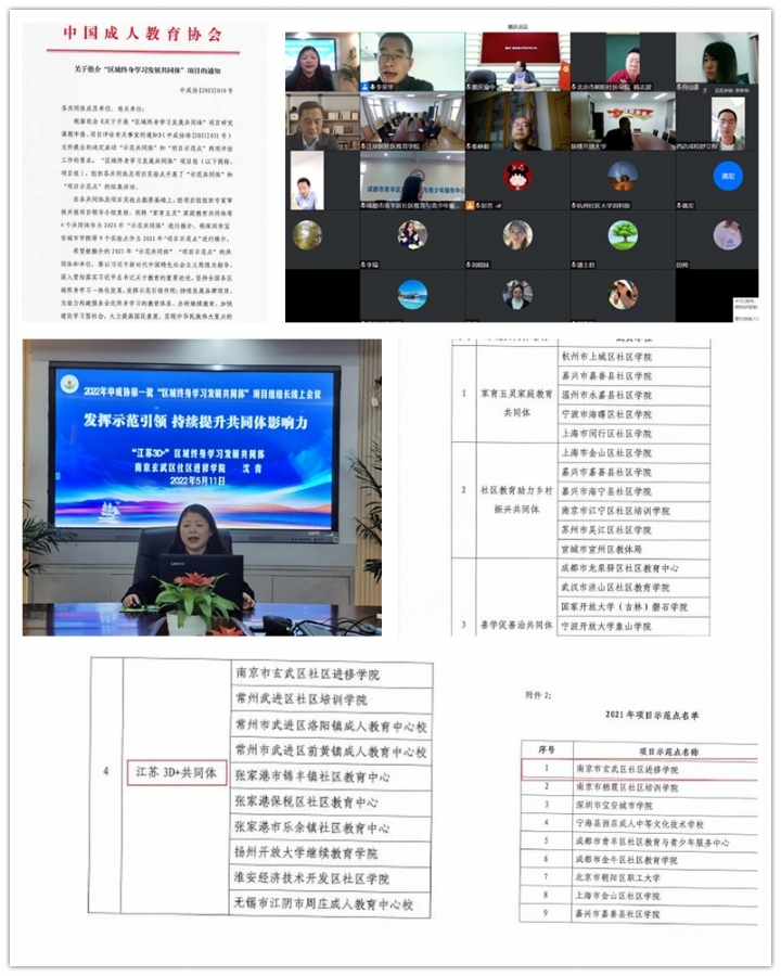 2022年5月11日,中国成人教育协会区域终身学习发展共同体总项目组,召开了全国第一批区域终身学习发展共同体项目组组长线上会议,玄武区社区进修学院办公室主任沈青代表“江苏3D+”区域终身学习发展共同体做了交流发言。2022年中成协【010】号文件《关于推介“区域终身学习发展共同体”项目的通知》公布了2021年全国区域终身学习发展“示范共同体”4个、“项目示范点”9个,其中“江苏3D+”区域终身学习发展共同体获“示范共同体”,玄武区社区进修学院获全国“项目示范点”。