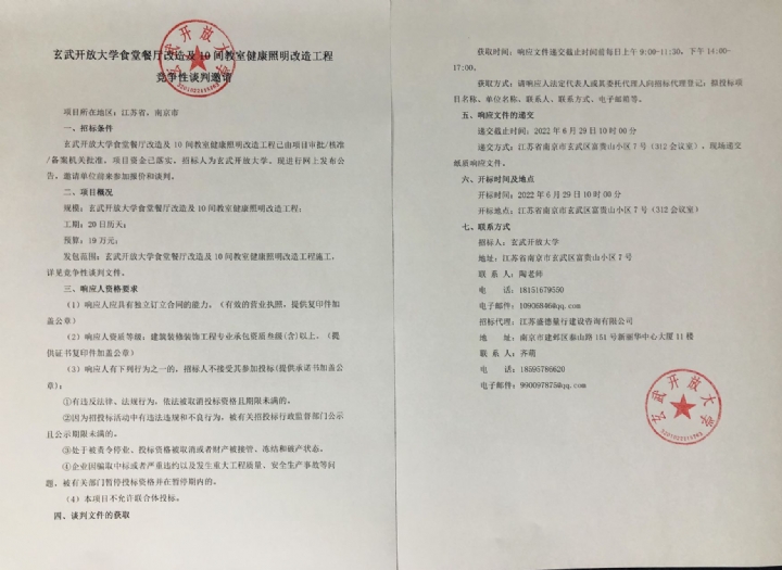 玄武开放大学食堂餐厅改造及10间教室健康照明改造工程竞争性谈判邀请