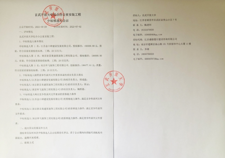 玄武开放大学组合办公室安装工程 中标候选人公示