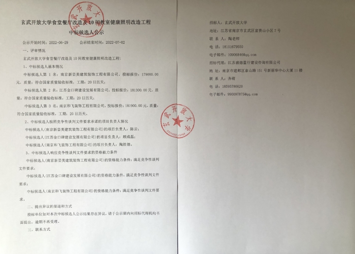 玄武开放大学食堂餐厅改造及10间教室健康照明改造工程 中标候选人公示