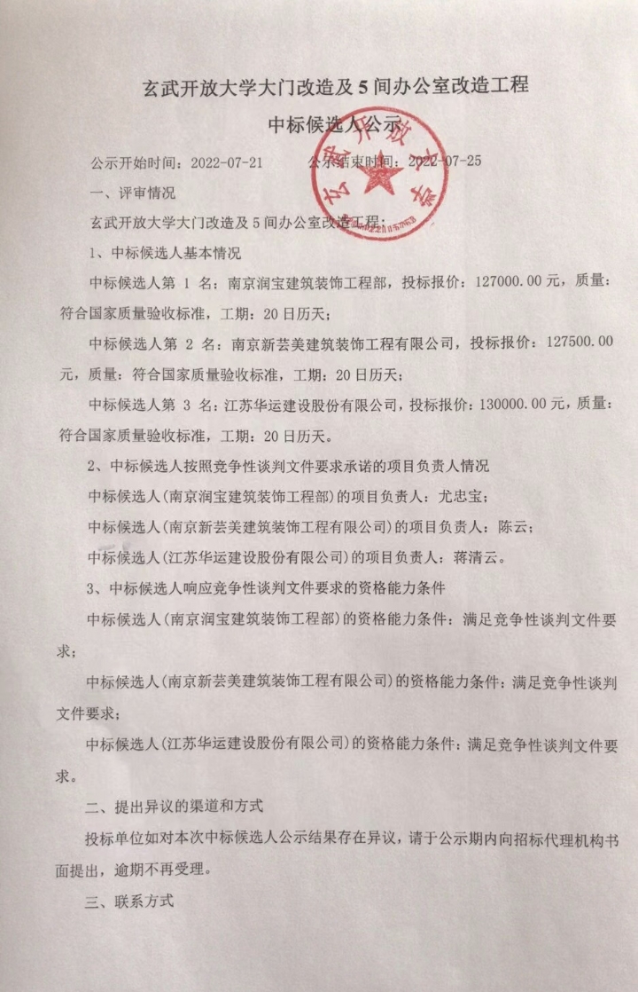 玄武开放大学大门改造及5间教室改造工程中标候选人公示