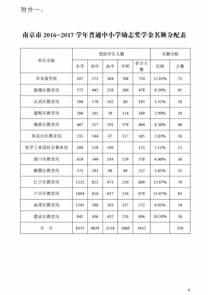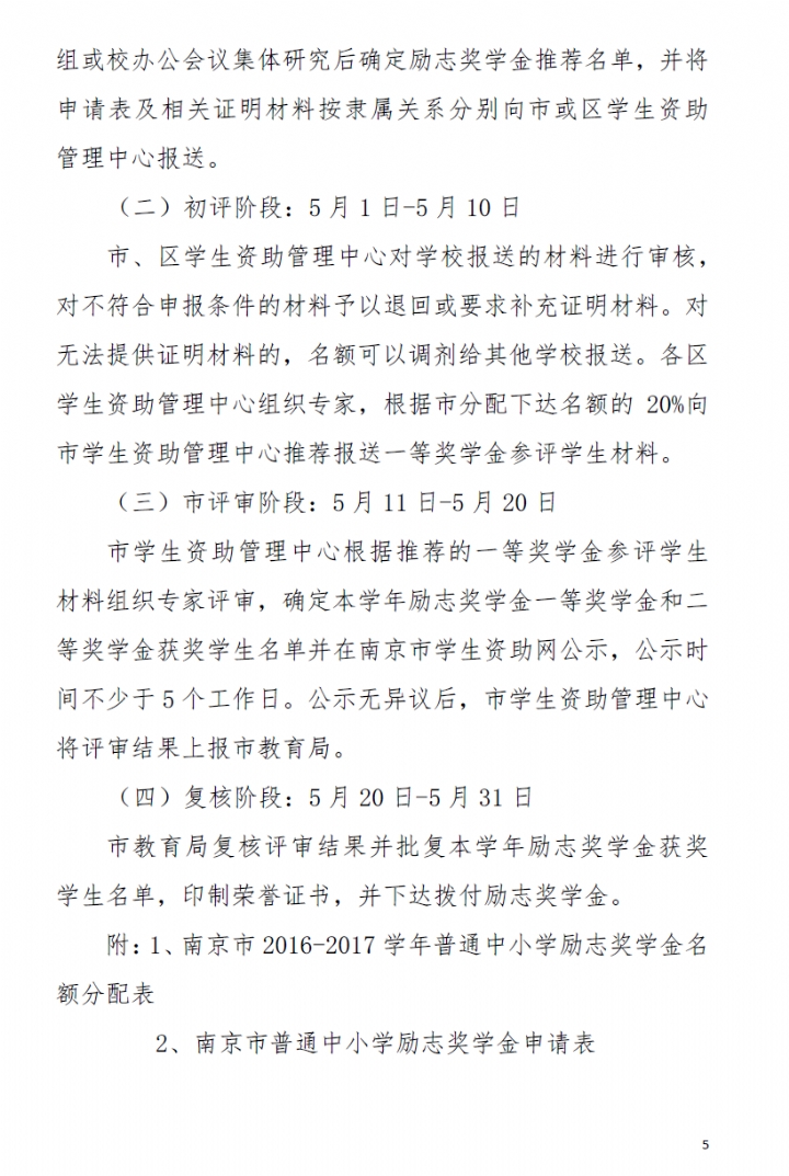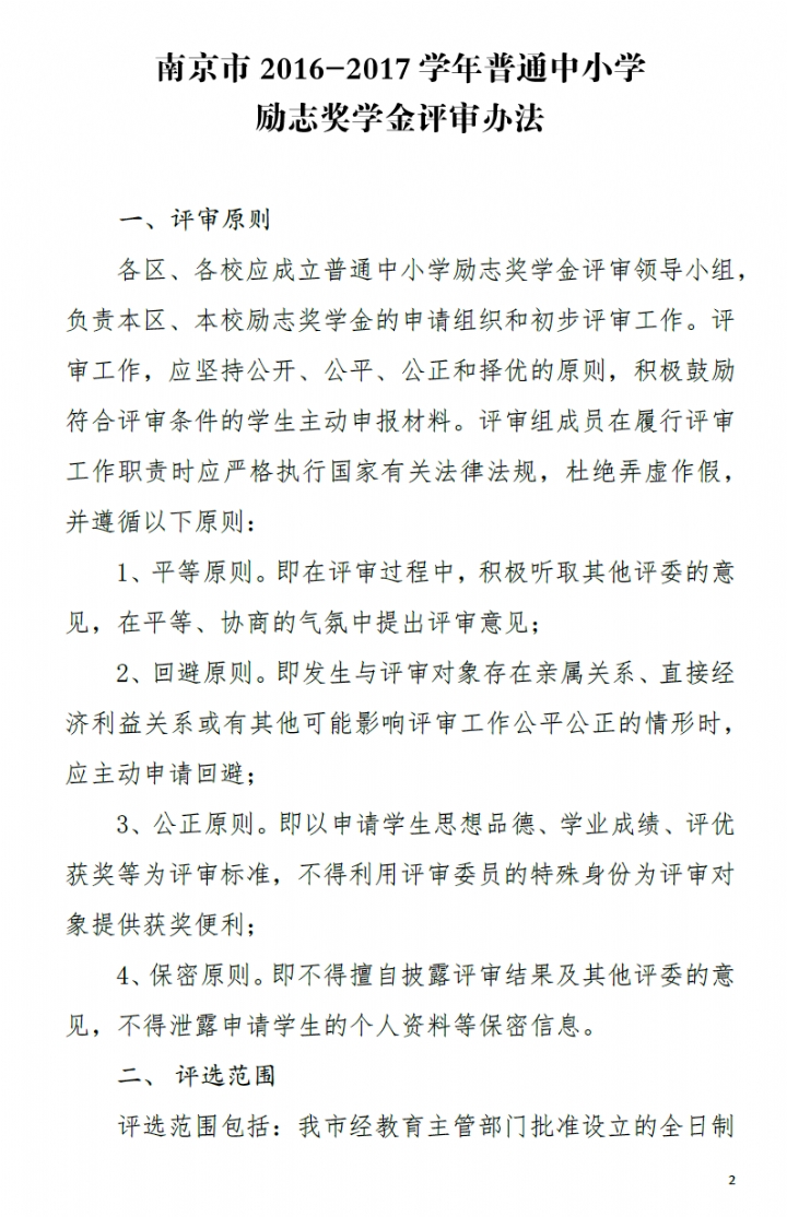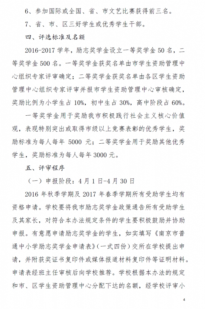 南京市2016-2017学年普通中小学励志奖学金评审办法