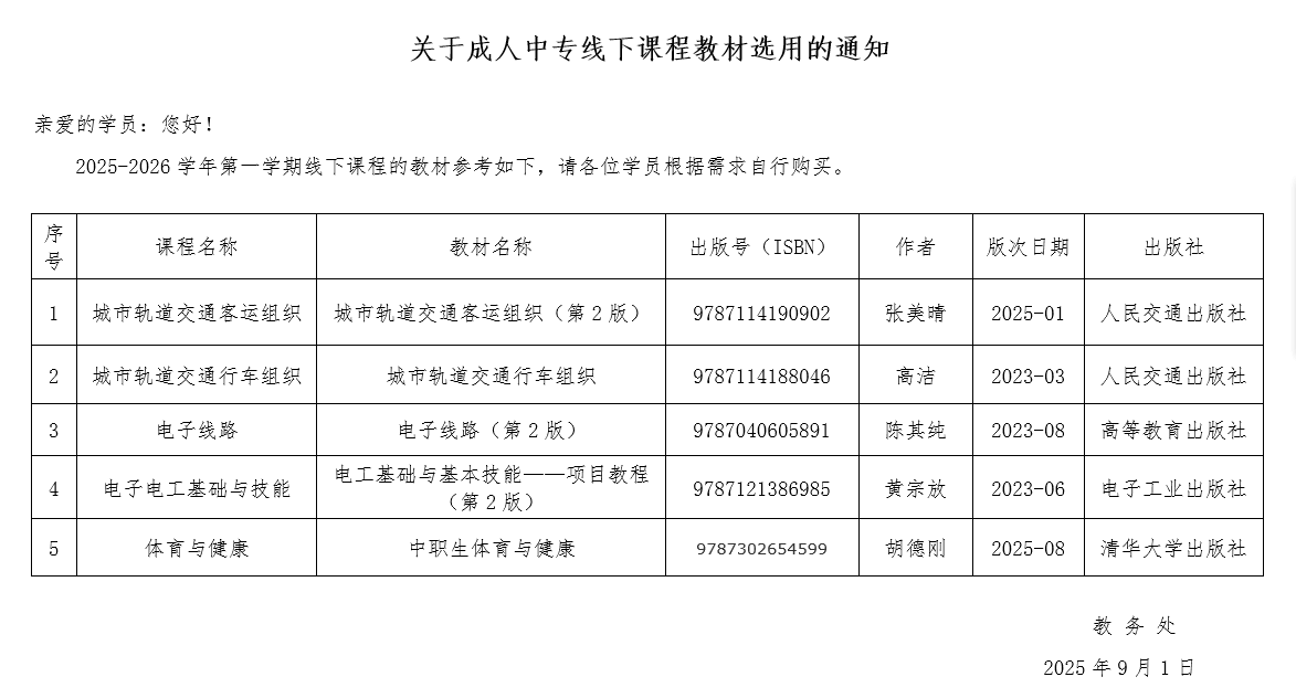 关于成人中专线下课程教材选用的通知
