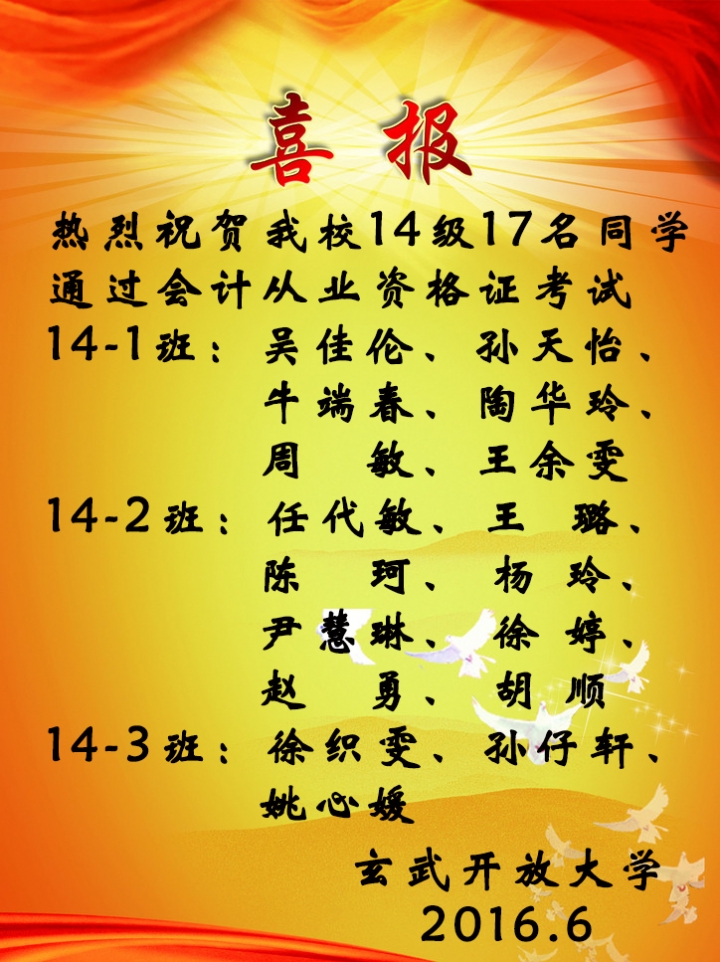 热烈祝贺我校14级17名同学顺利通过会计从业资格证考试