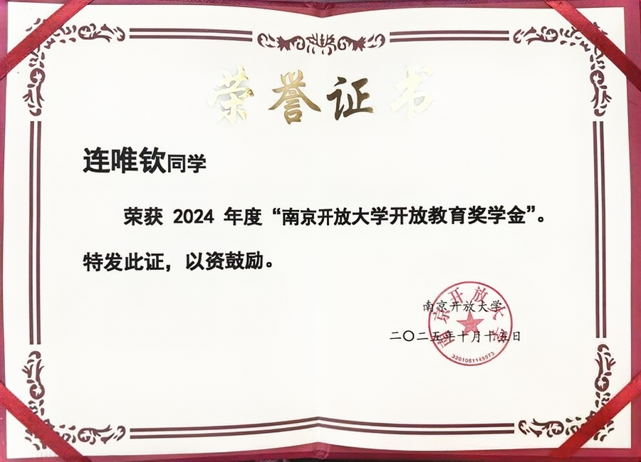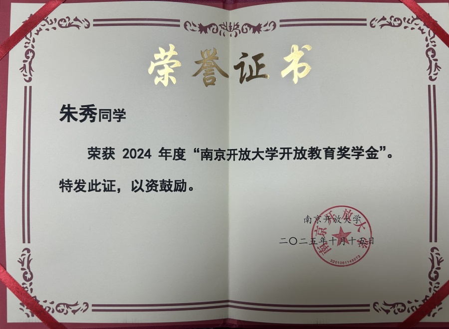 根据《关于印发<南京开放大学开放教育优秀毕业生评选及奖励办法><南京开放大学开放教育奖学金评选及奖励办法>的通知》(宁开大〔2022〕3 号)文件精神,我校按照通知要求组织了开放教育奖学金的初评和推荐工作。经市校开放教育奖学金评选小组评审并公示无异议,最终确定我校朱秀、连唯钦2位学员获得“2024 年度南京开放大学开放教育奖学金”。