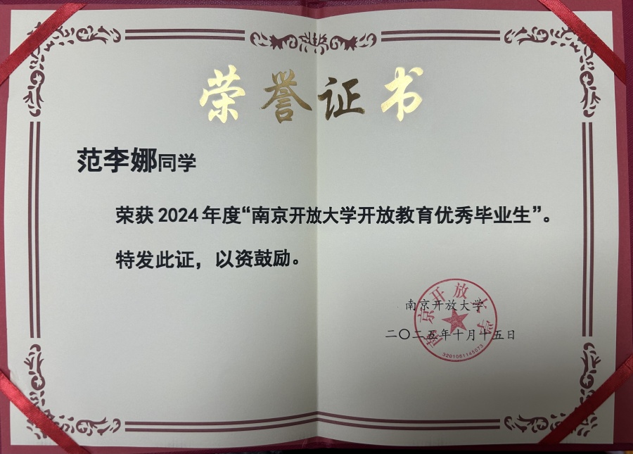 根据《关于开展2024年度南京开放大学优秀毕业生评选推荐活动的通知》相关文件精神,我校按照通知要求组织了2024年度优秀毕业生的初评和推荐工作。市校优秀毕业生评选小组评审并公示,决定授予我校范李娜学员“2024 年度南京开放大学开放教育优秀毕业生”称号。