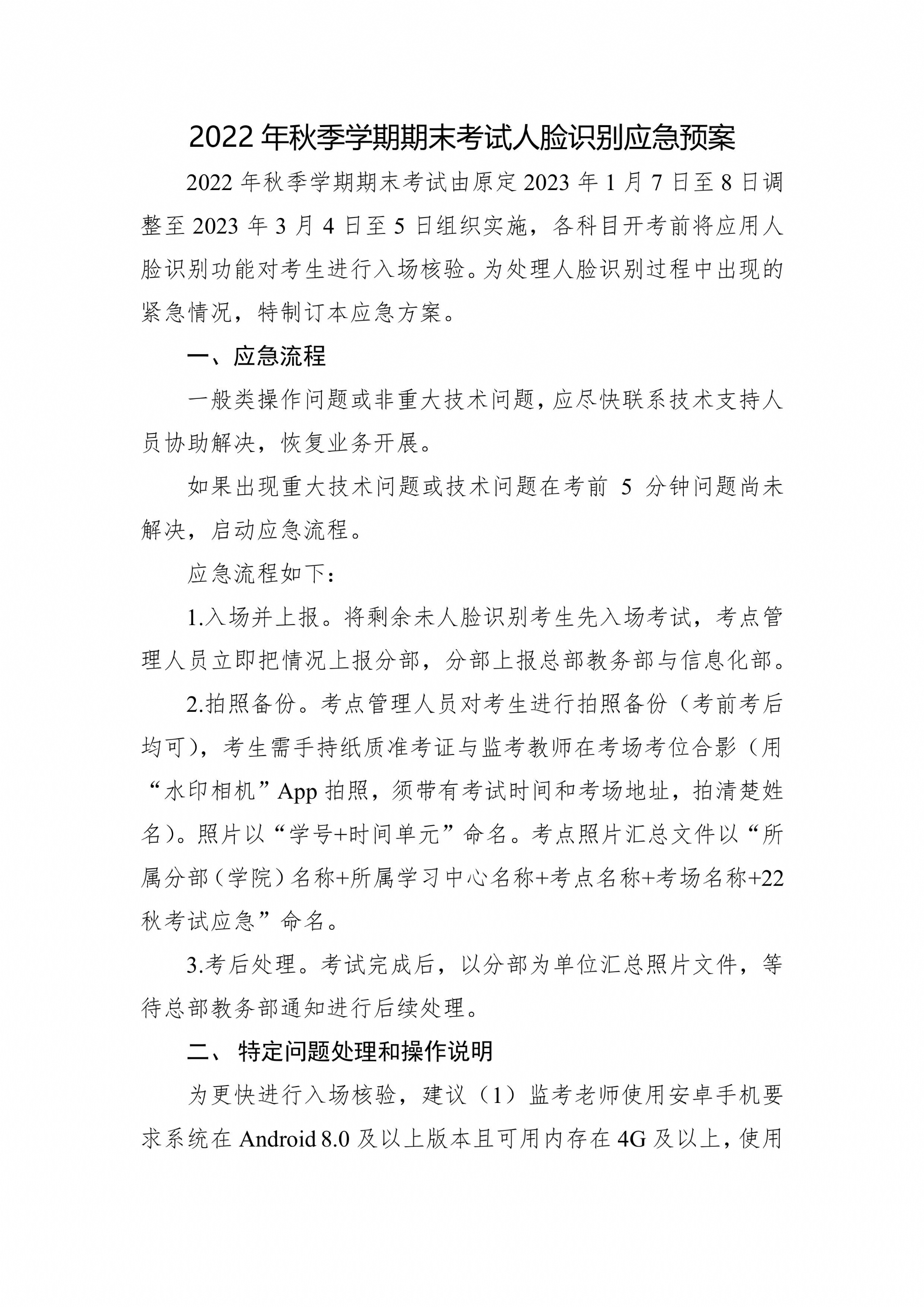 2022年秋季学期期末考试人脸识别应急预案
