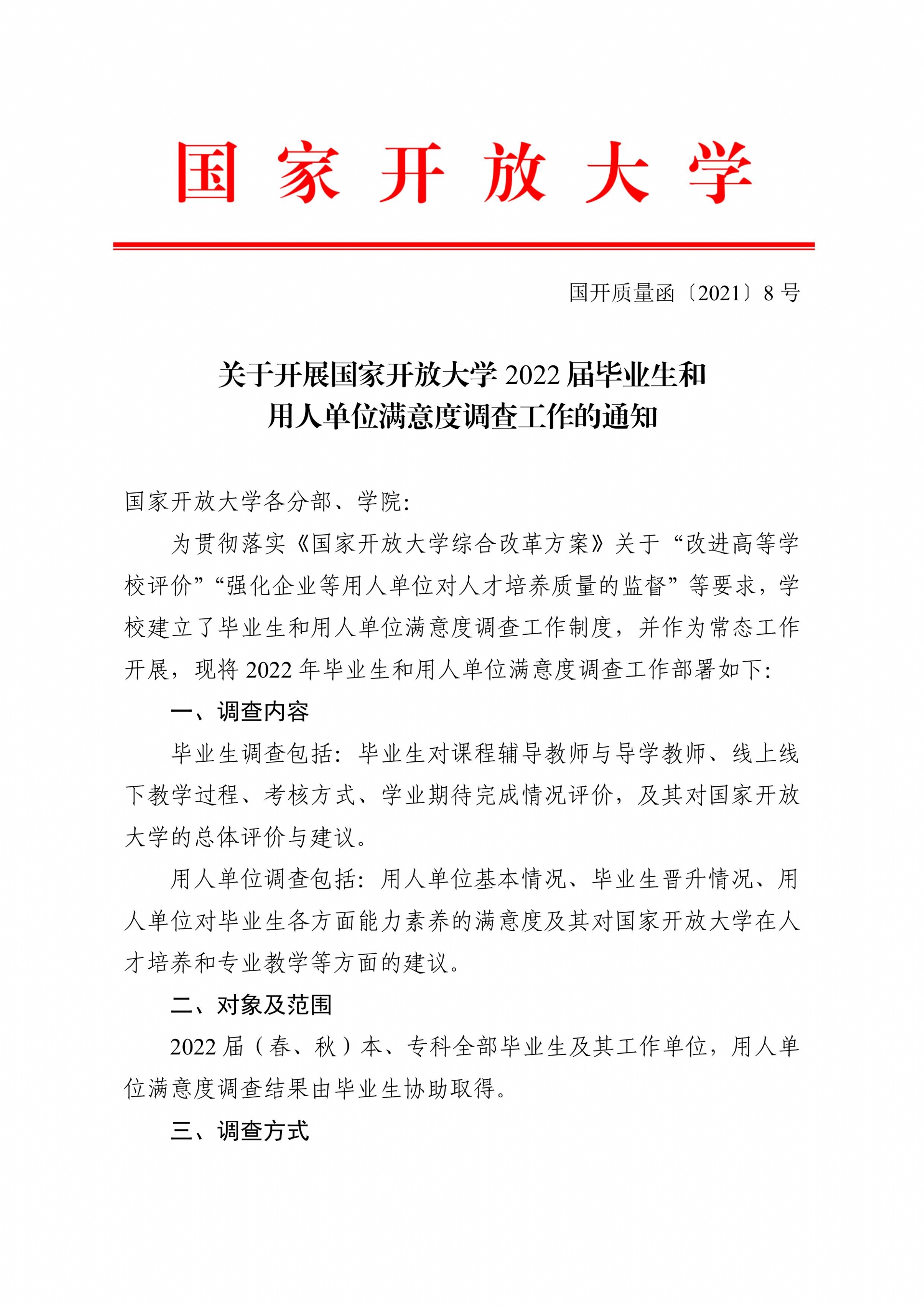 关于开展国家开放大学2022届毕业生和用人单位满意度调查工作的通知